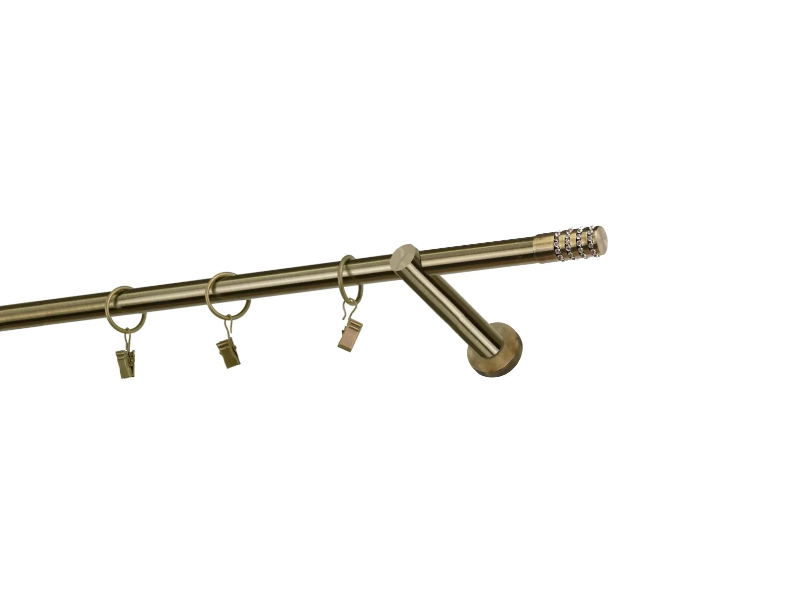 Felületkezelt egysoros fém függönykarnis antik (matt arany) árnyalat. Minőségi galvanizált fém függönykarnisok. A galvanizálás nagyobb felületi szilárdságot, nagyobb karcállóságot és sima felületet biztosít. Készletként szállítjuk.