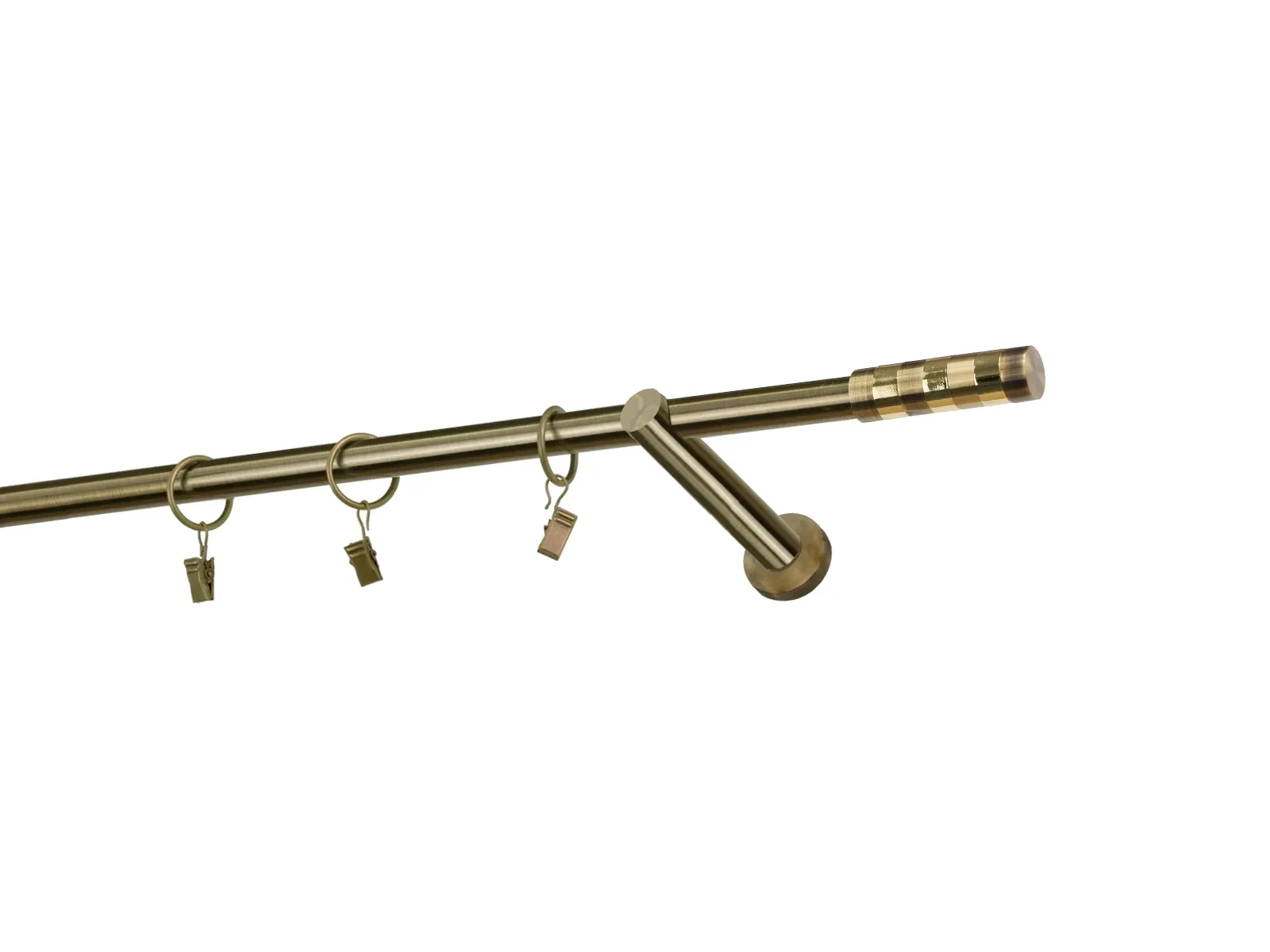 Felületkezelt egysoros fém függönykarnis antik (matt arany) árnyalat. Minőségi galvanizált fém függönykarnisok. A galvanizálás nagyobb felületi szilárdságot, nagyobb karcállóságot és sima felületet biztosít. Készletként szállítjuk.