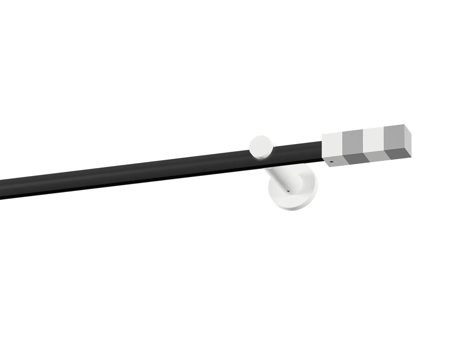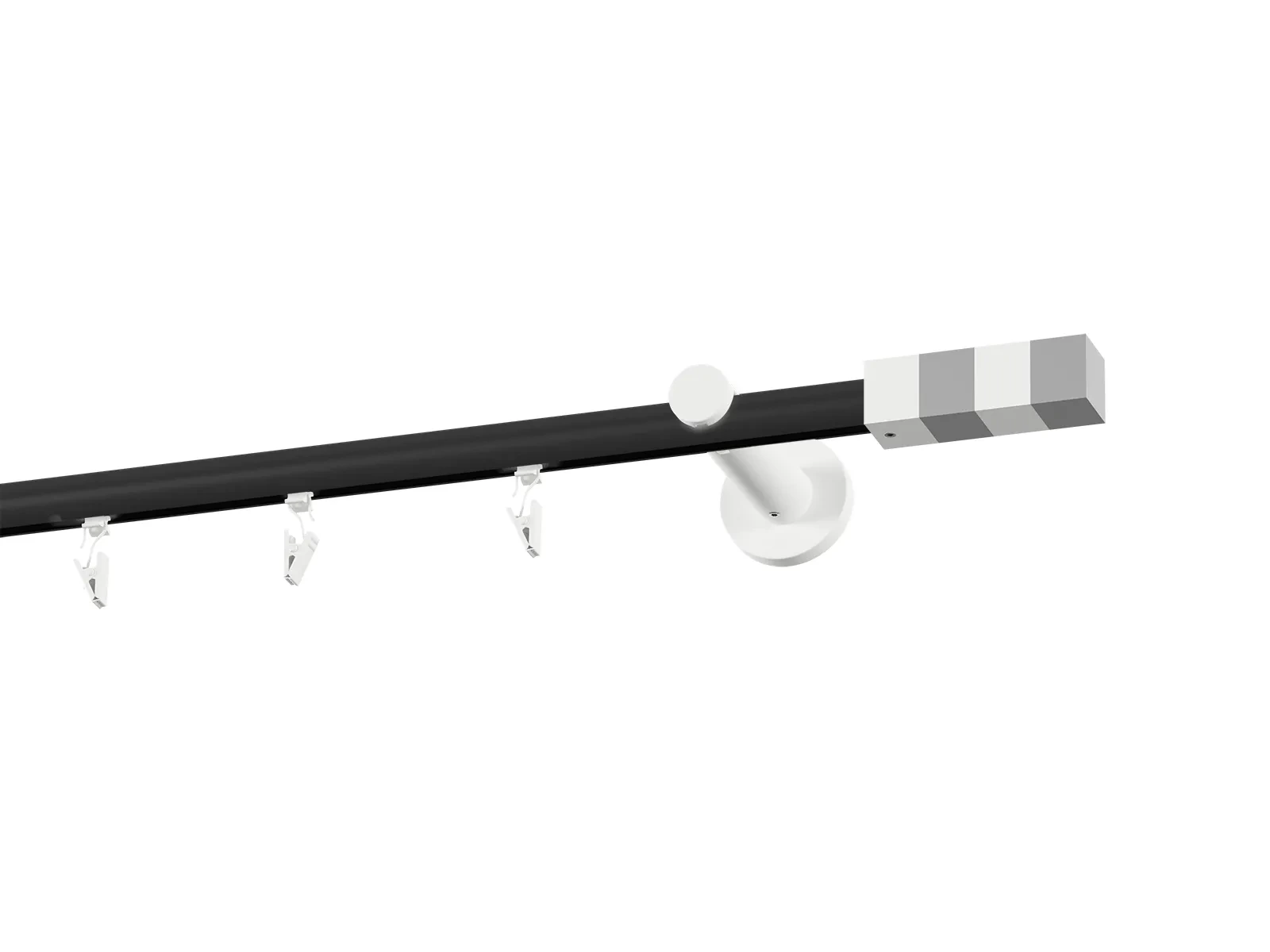 Jednoradová drážková garniža s povrchovou úpravou - čierno biela lakovaná. Garniže sú dodávané sú v kompletoch. Tvar koncovky a typ držiaka podľa zadaného výberu.