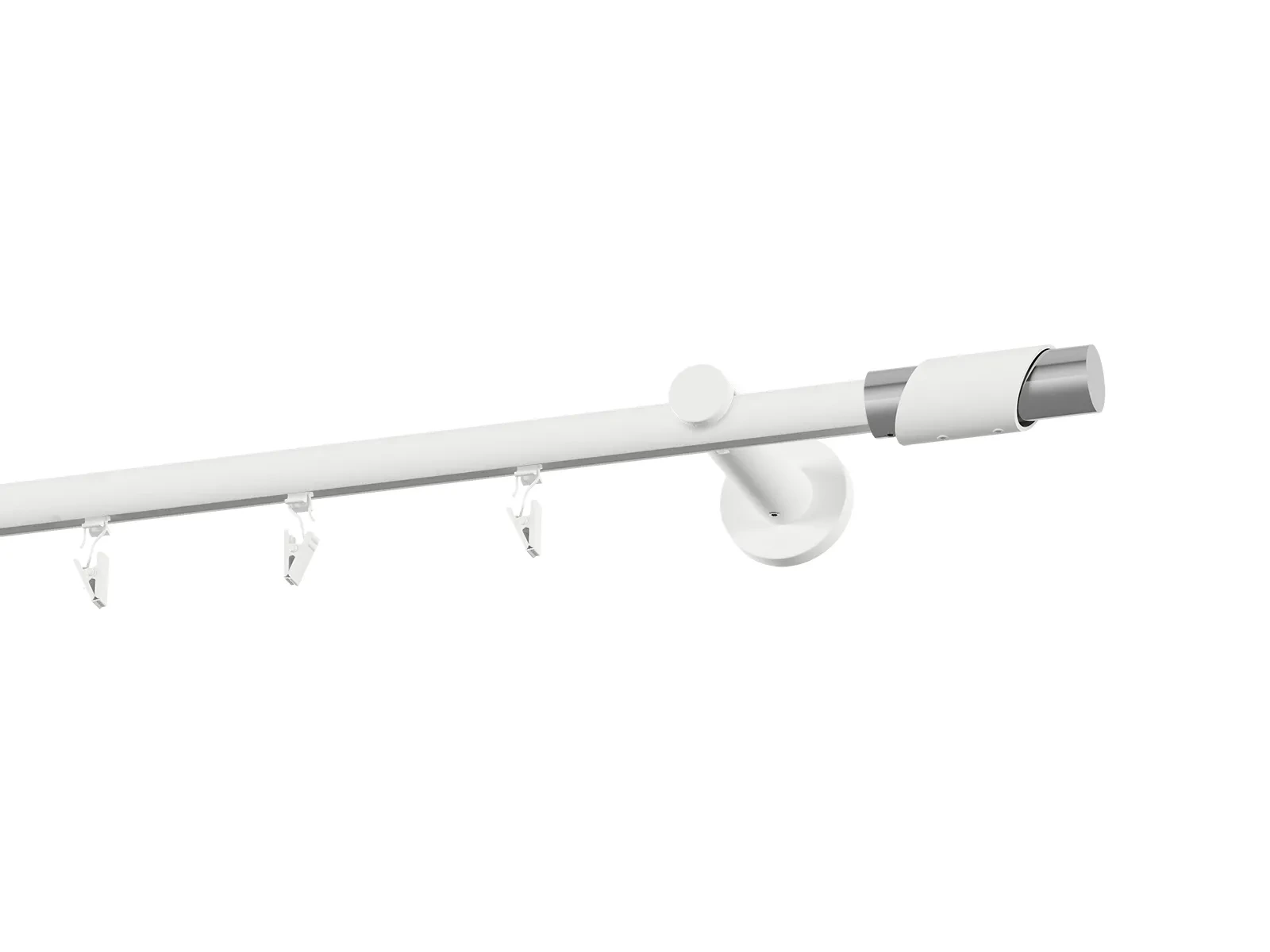 Jednoradová drážková garniža s povrchovou úpravou - biela lakovaná. Garniže sú dodávané sú v kompletoch. Tvar koncovky a typ držiaka podľa zadaného výberu.