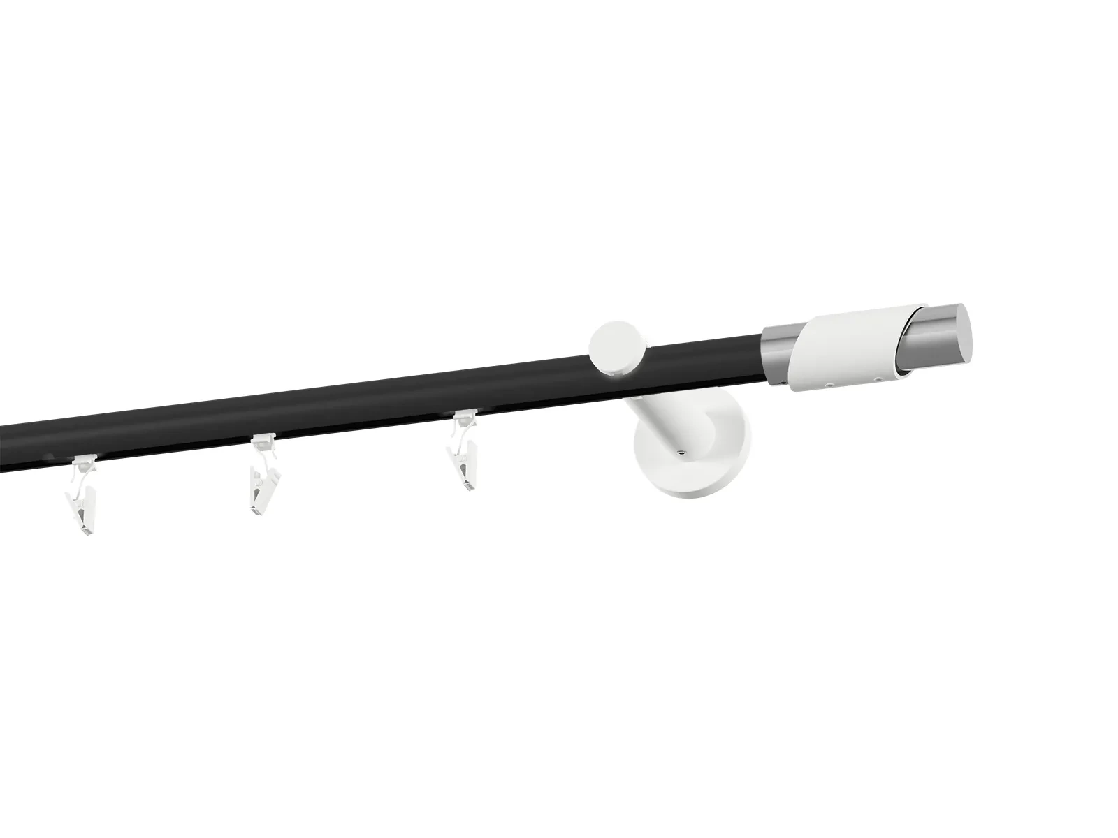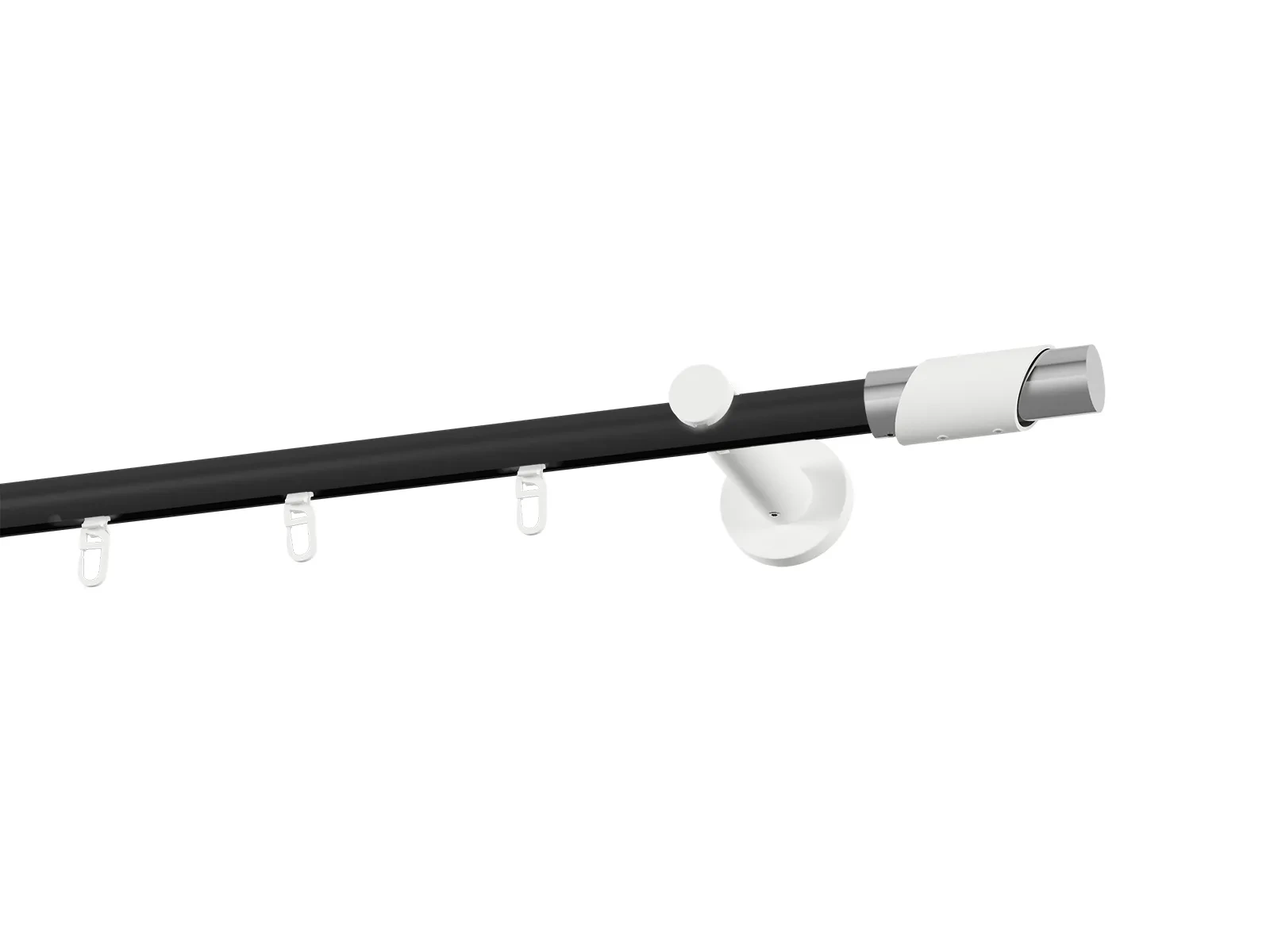 Jednoradová drážková garniža s povrchovou úpravou - čierno biela lakovaná. Garniže sú dodávané sú v kompletoch. Tvar koncovky a typ držiaka podľa zadaného výberu.