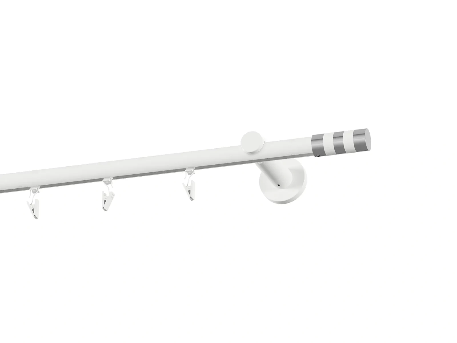 Jednoradová drážková garniža s povrchovou úpravou - biela lakovaná. Garniže sú dodávané sú v kompletoch. Tvar koncovky a typ držiaka podľa zadaného výberu.