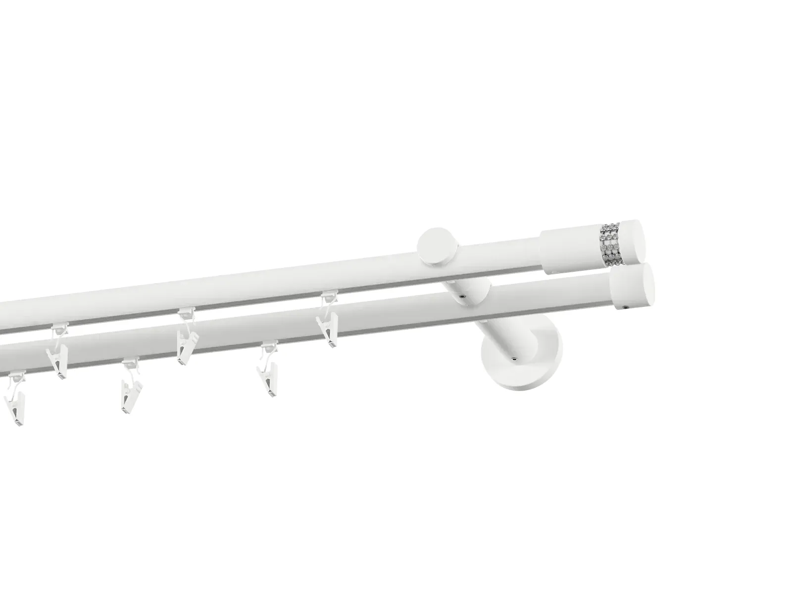 Dvojradová drážková garniža s povrchovou úpravou - biela lakovaná. Garniže sú dodávané sú v kompletoch. Tvar koncovky a typ držiaka podľa zadaného výberu.