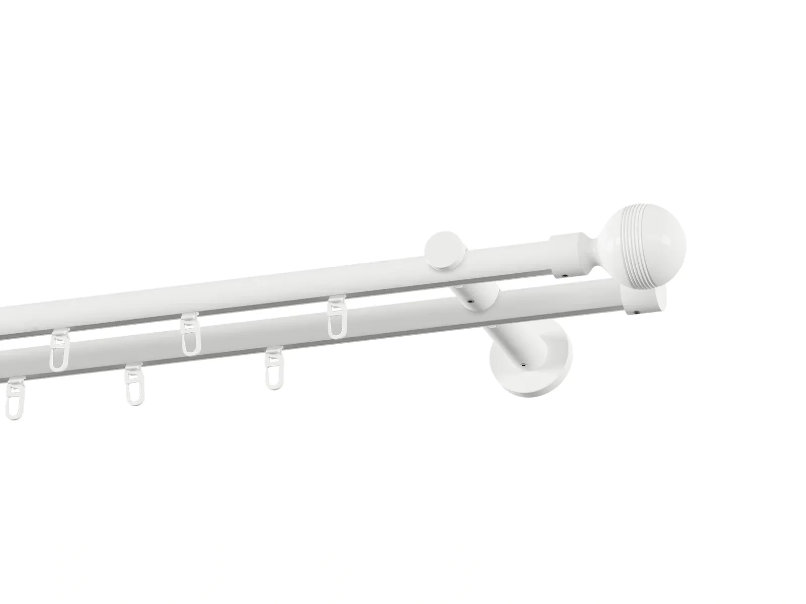 Dvojradová drážková garniža s povrchovou úpravou - biela lakovaná. Garniže sú dodávané sú v kompletoch. Tvar koncovky a typ držiaka podľa zadaného výberu.