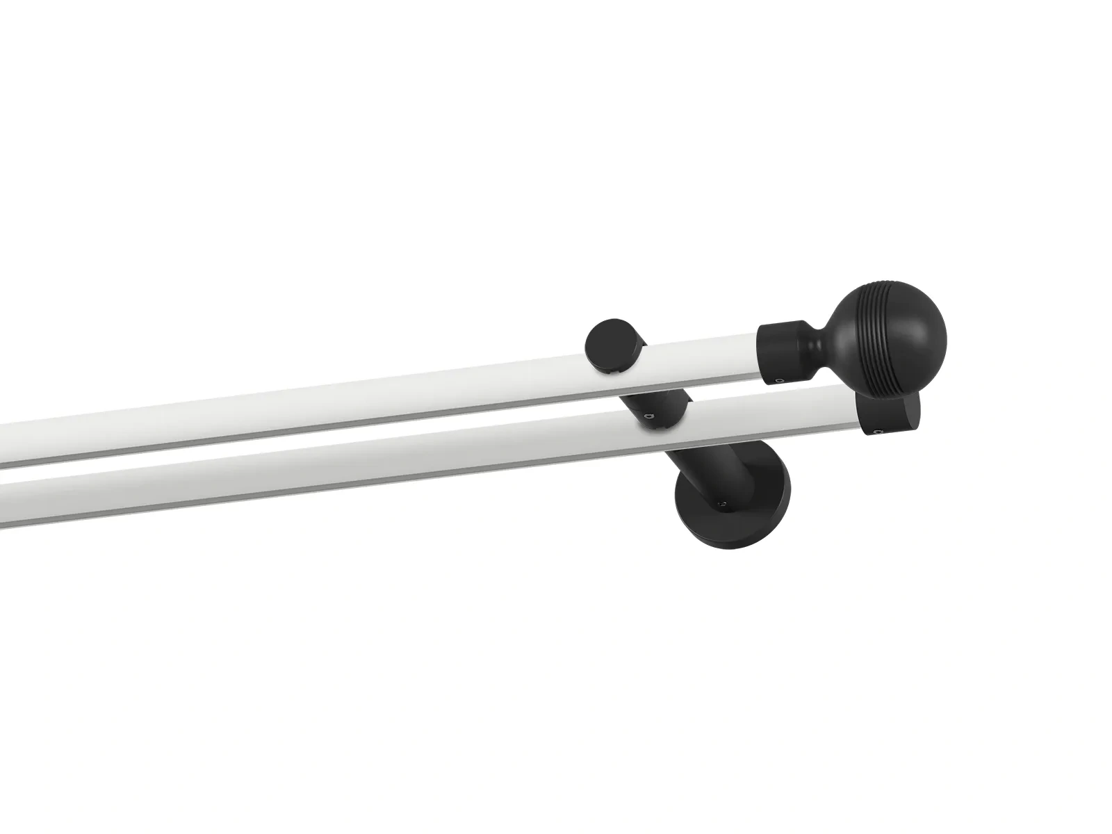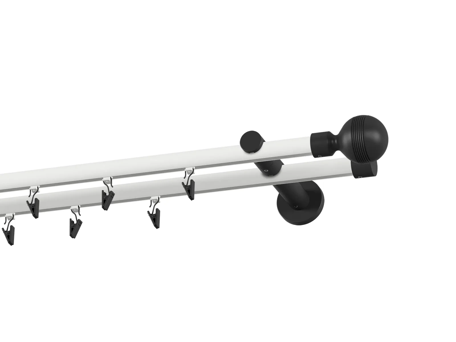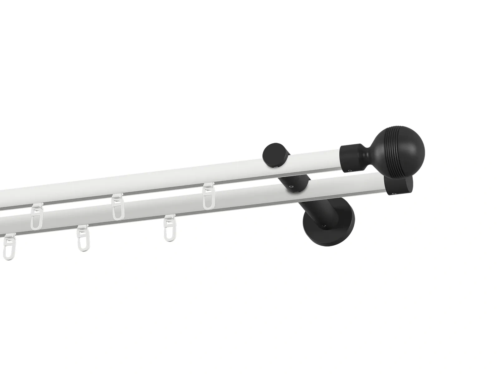 Dvojradová drážková garniža s povrchovou úpravou - bielo čierna lakovaná. Garniže sú dodávané sú v kompletoch. Tvar koncovky a typ držiaka podľa zadaného výberu.