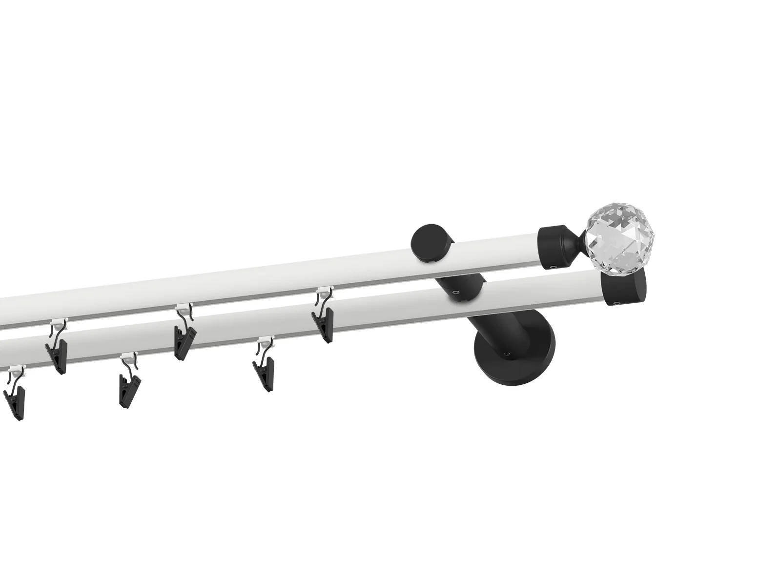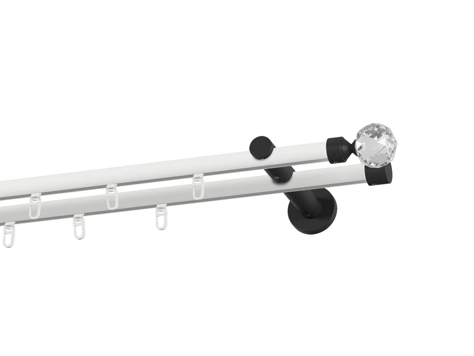 Dvojradová drážková garniža s povrchovou úpravou - bielo čierna lakovaná. Garniže sú dodávané sú v kompletoch. Tvar koncovky a typ držiaka podľa zadaného výberu.
