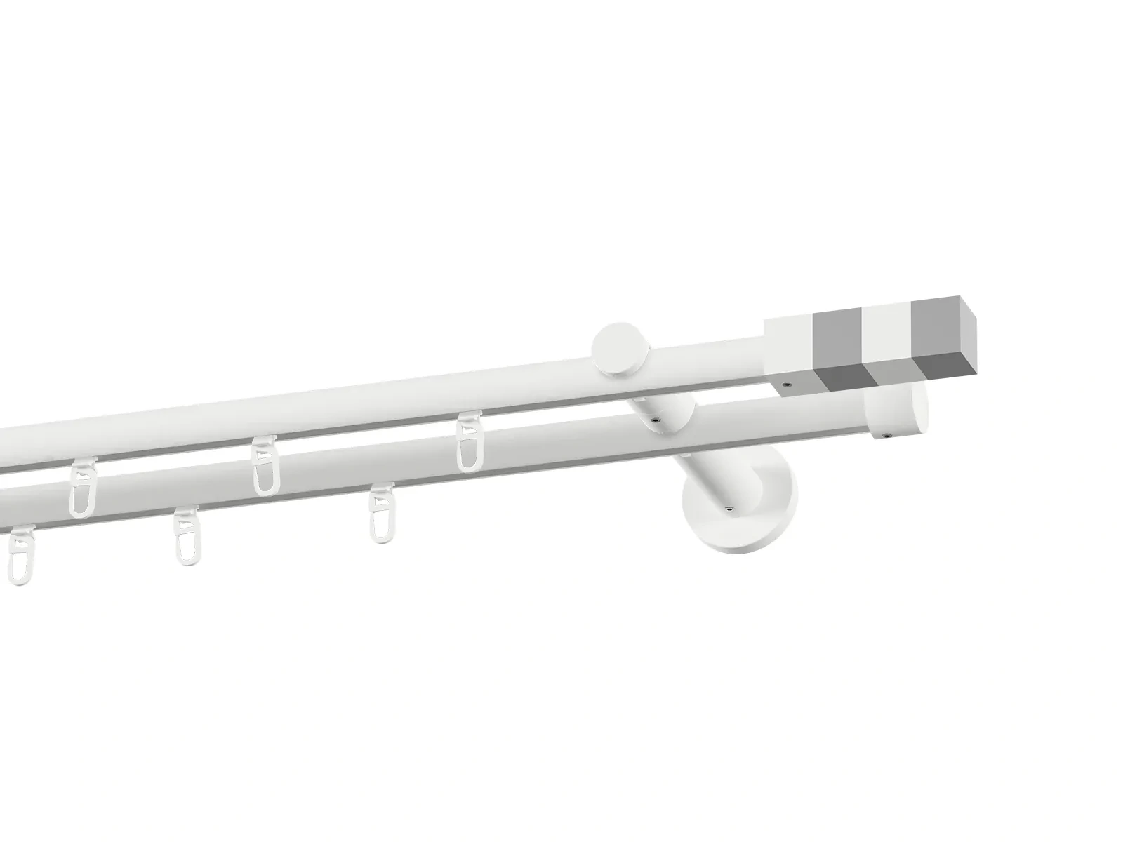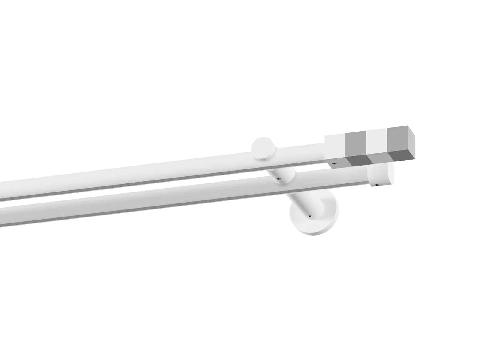 Dvojradová drážková garniža s povrchovou úpravou - biela lakovaná. Garniže sú dodávané sú v kompletoch. Tvar koncovky a typ držiaka podľa zadaného výberu.