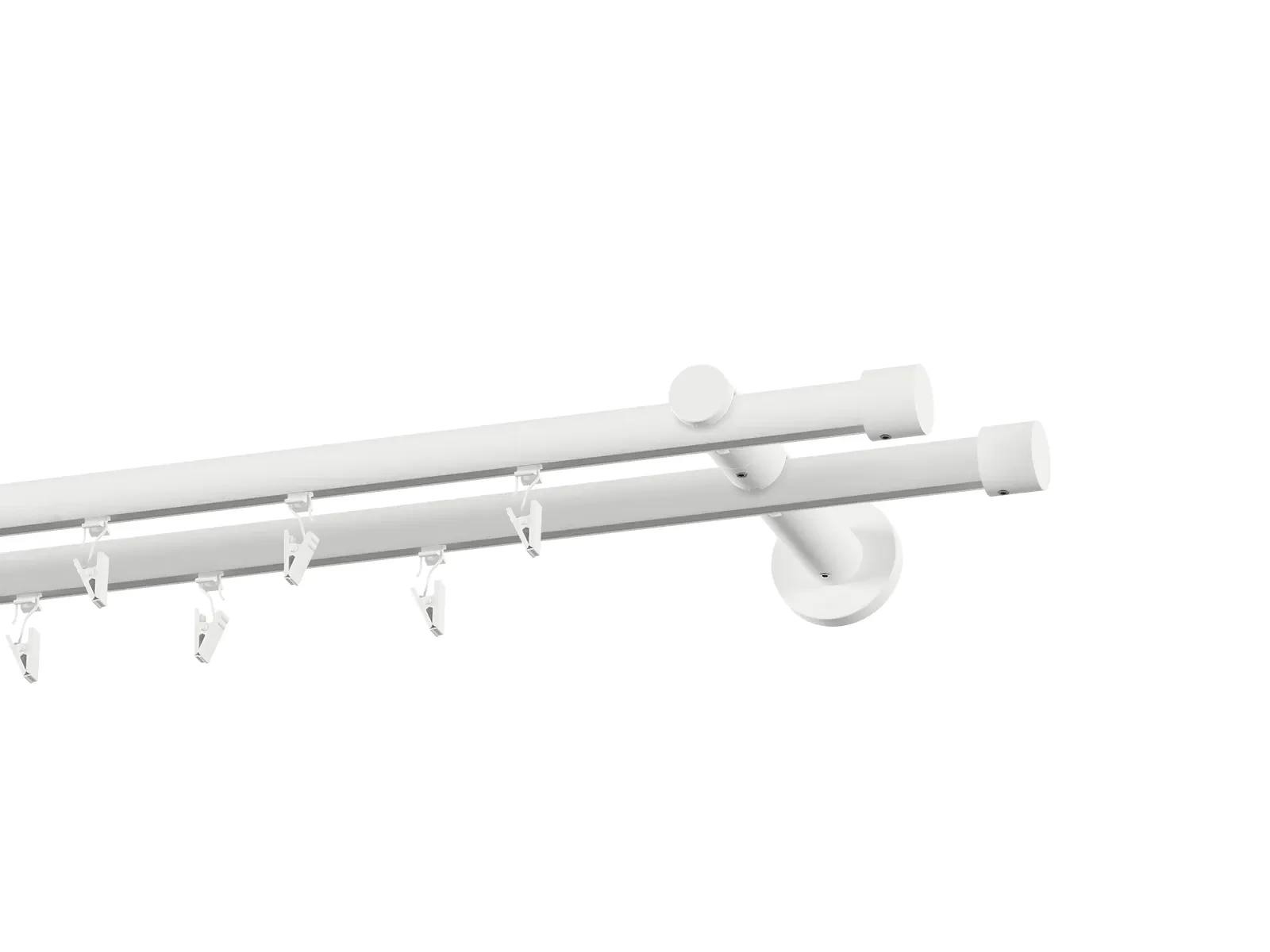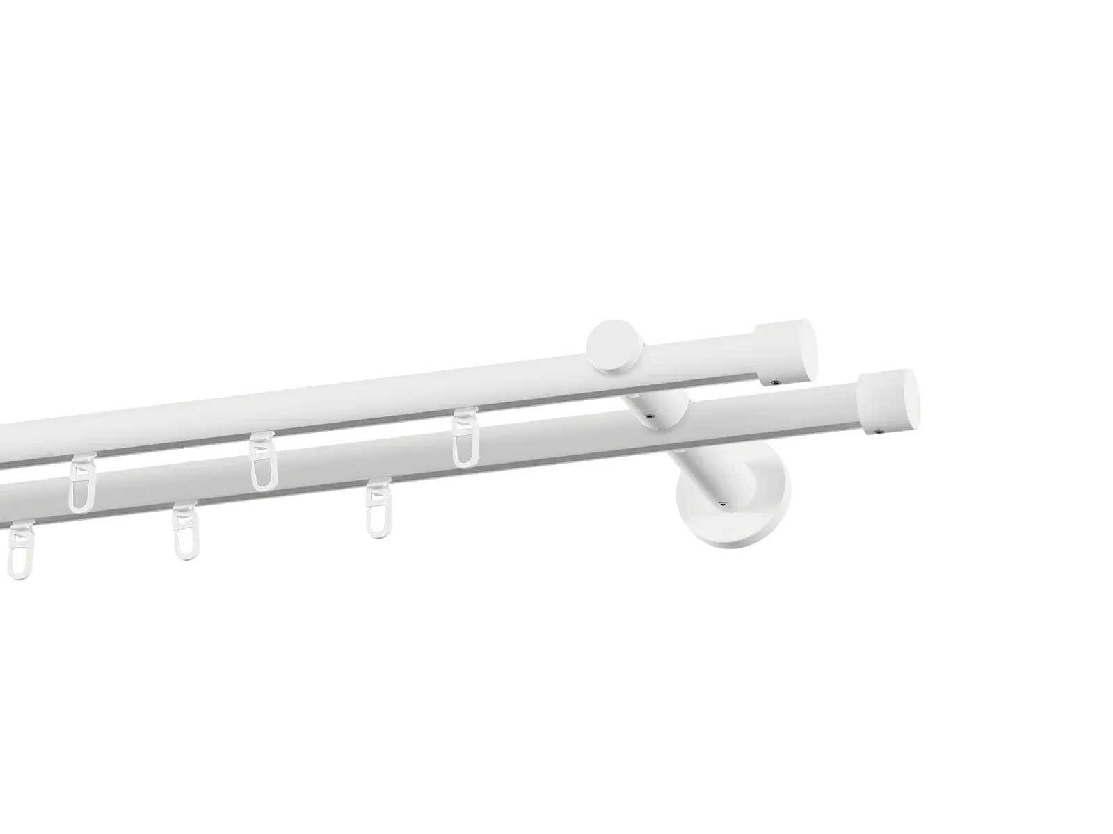 Dvojradová drážková garniža s povrchovou úpravou - biela lakovaná. Garniže sú dodávané sú v kompletoch. Tvar koncovky a typ držiaka podľa zadaného výberu.