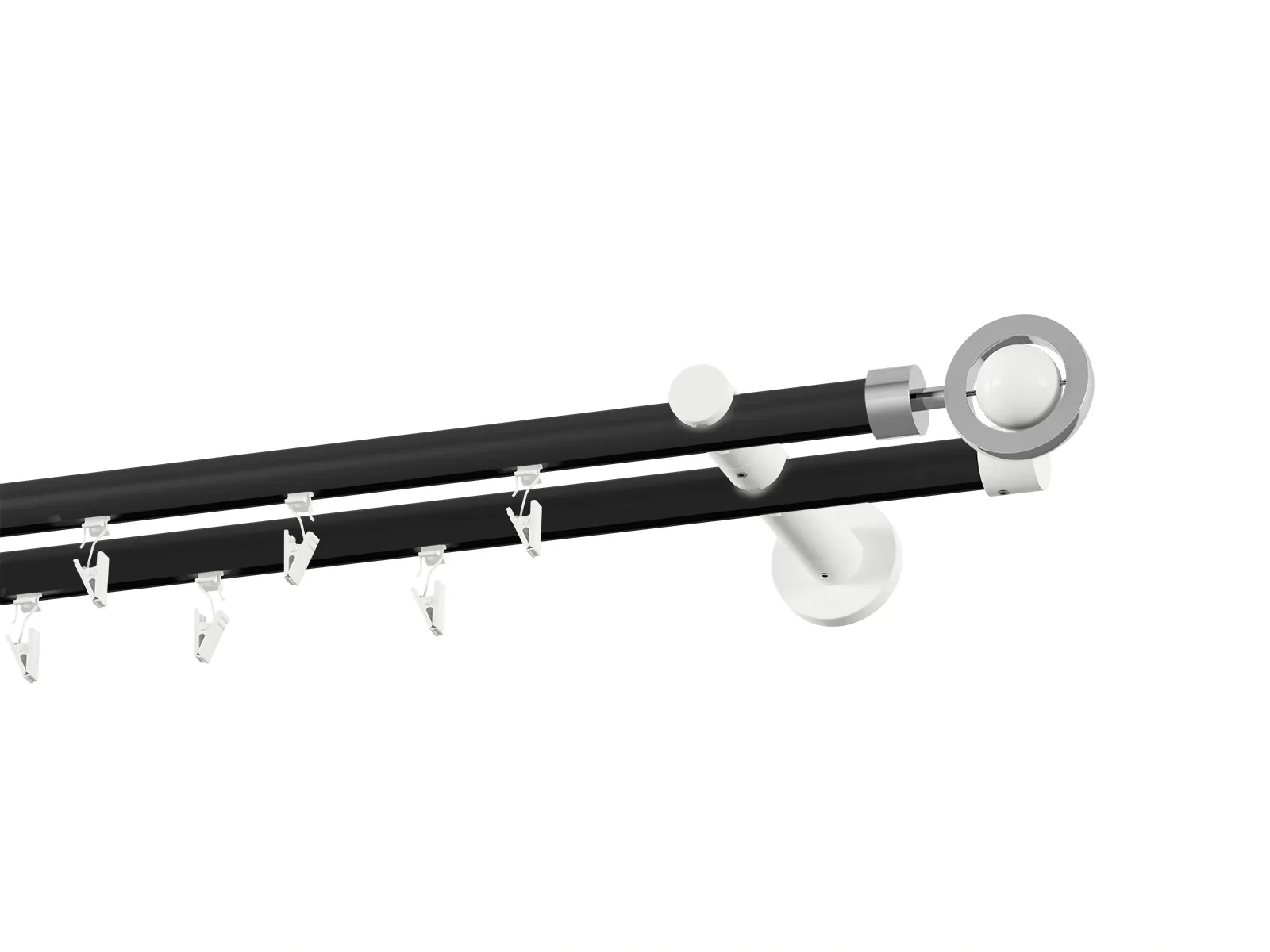 Dvojradová drážková garniža s povrchovou úpravou - čierno biela lakovaná. Garniže sú dodávané sú v kompletoch. Tvar koncovky a typ držiaka podľa zadaného výberu.