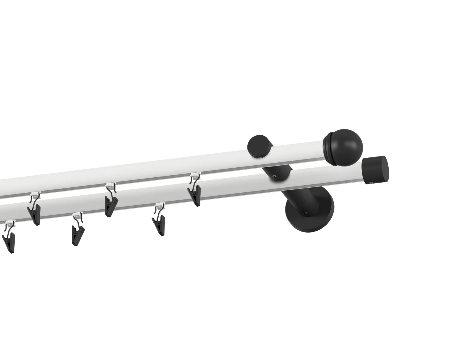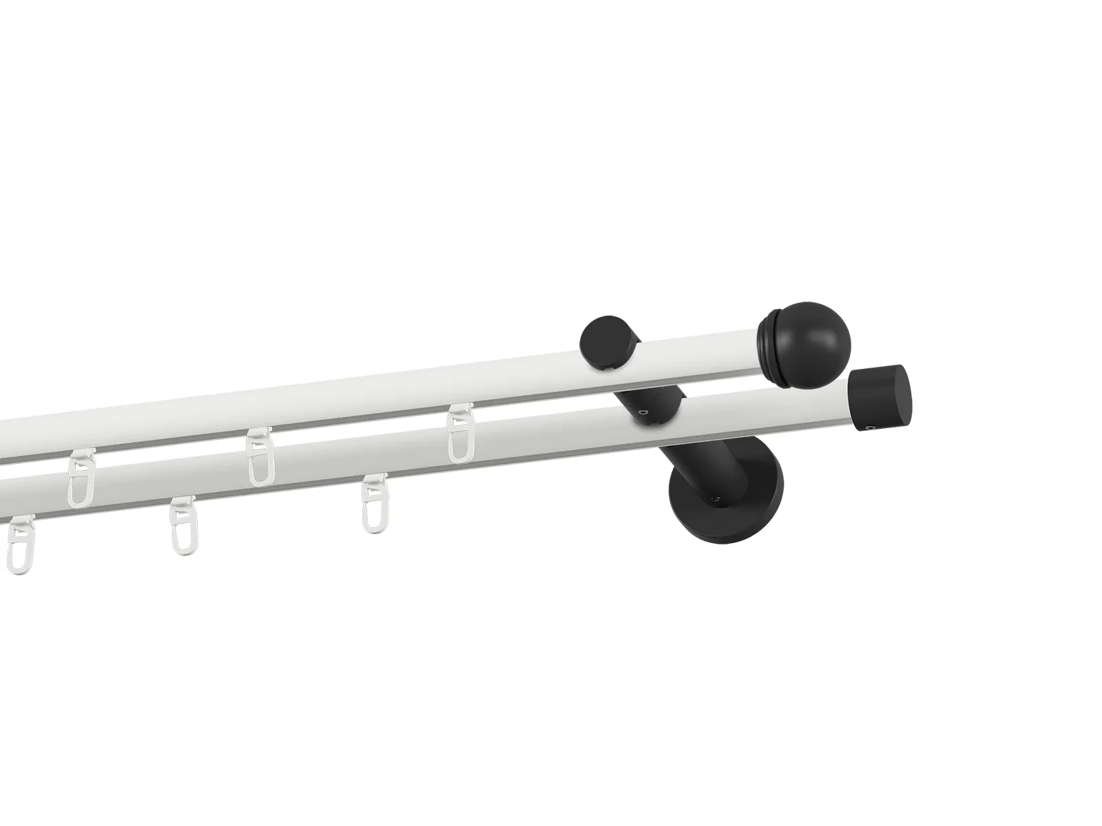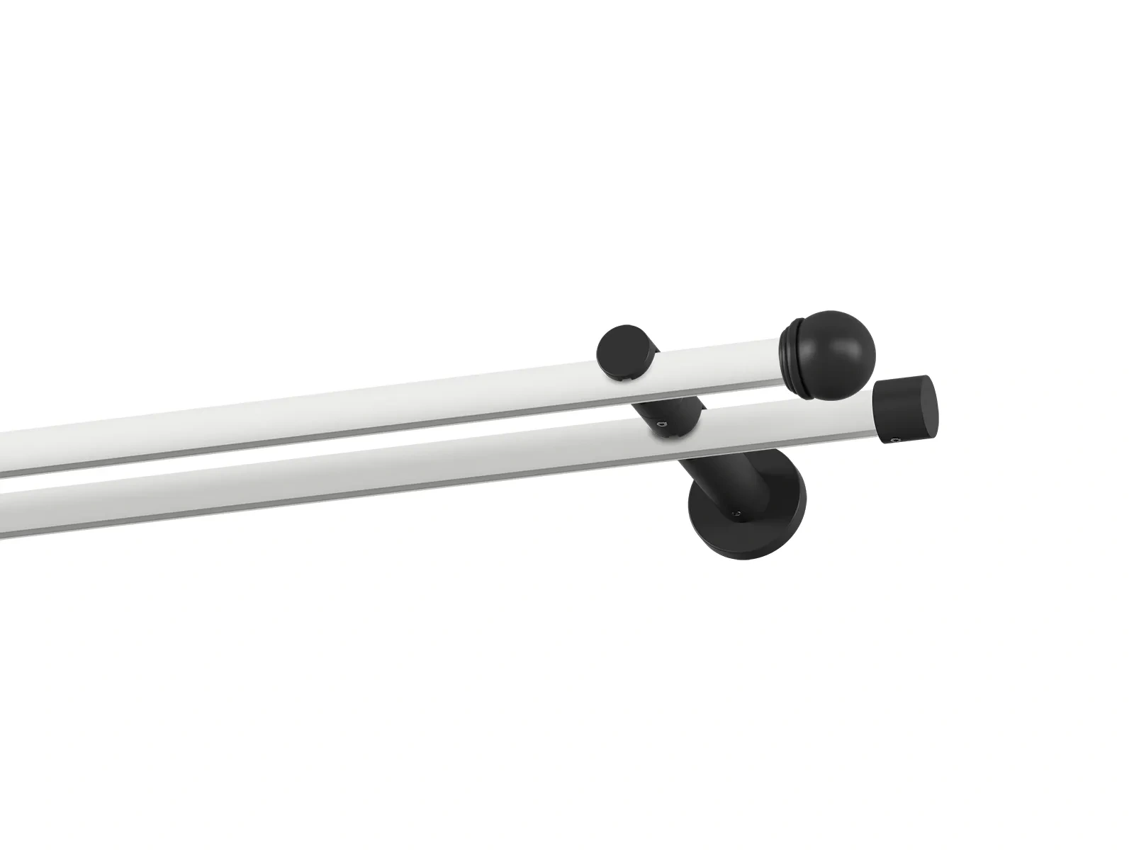 Dvojradová drážková garniža s povrchovou úpravou - bielo čierna lakovaná. Garniže sú dodávané sú v kompletoch. Tvar koncovky a typ držiaka podľa zadaného výberu.