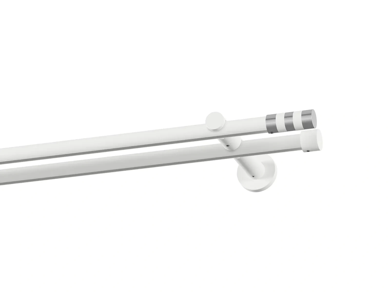 Dvojradová drážková garniža s povrchovou úpravou - biela lakovaná. Garniže sú dodávané sú v kompletoch. Tvar koncovky a typ držiaka podľa zadaného výberu.