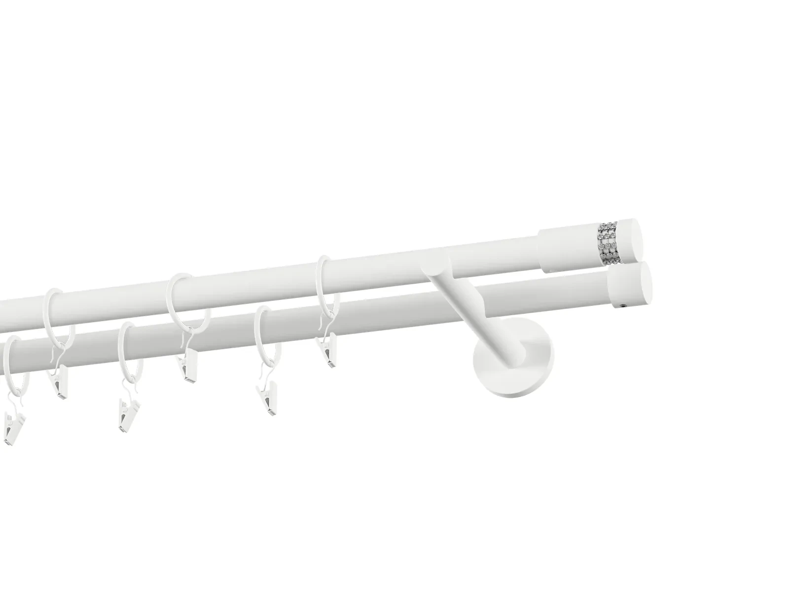 Dvojradová garniža s povrchovou úpravou - biela lakovaná. Garniže sú dodávané sú v kompletoch. Tvar koncovky a typ držiaka podľa zadaného výberu.