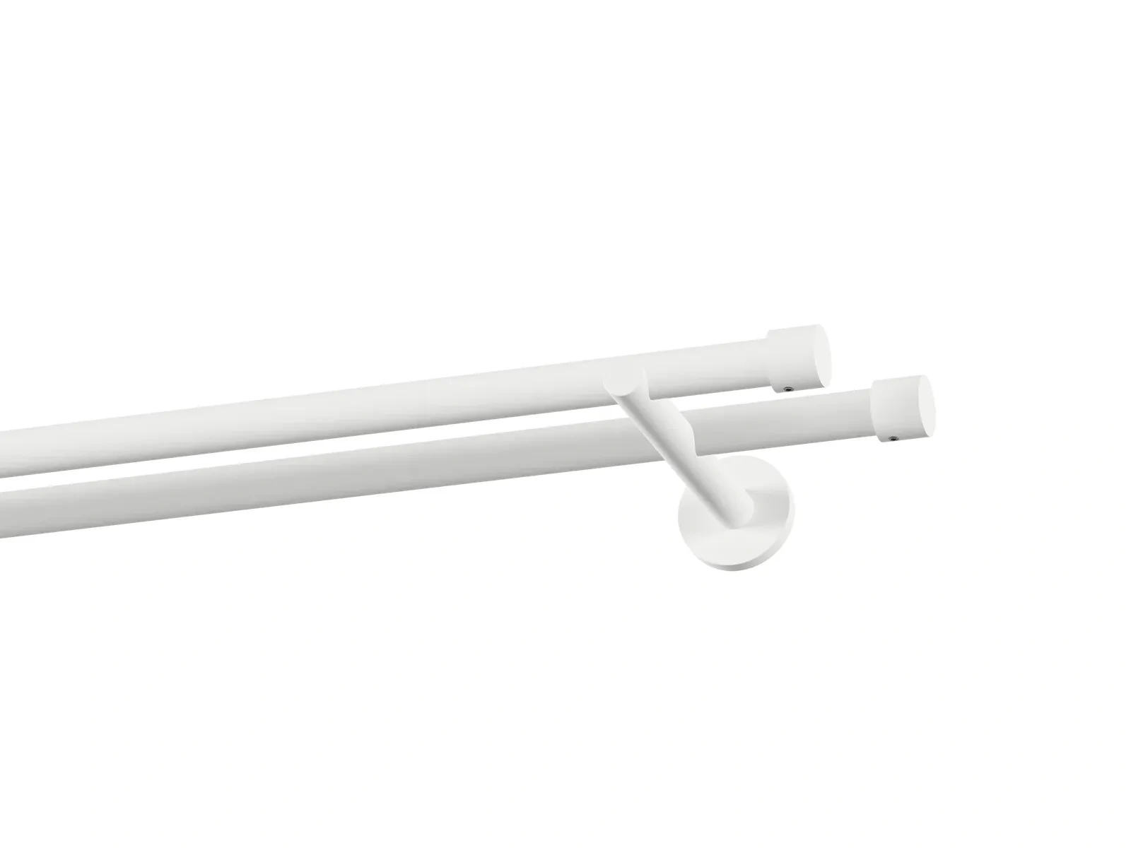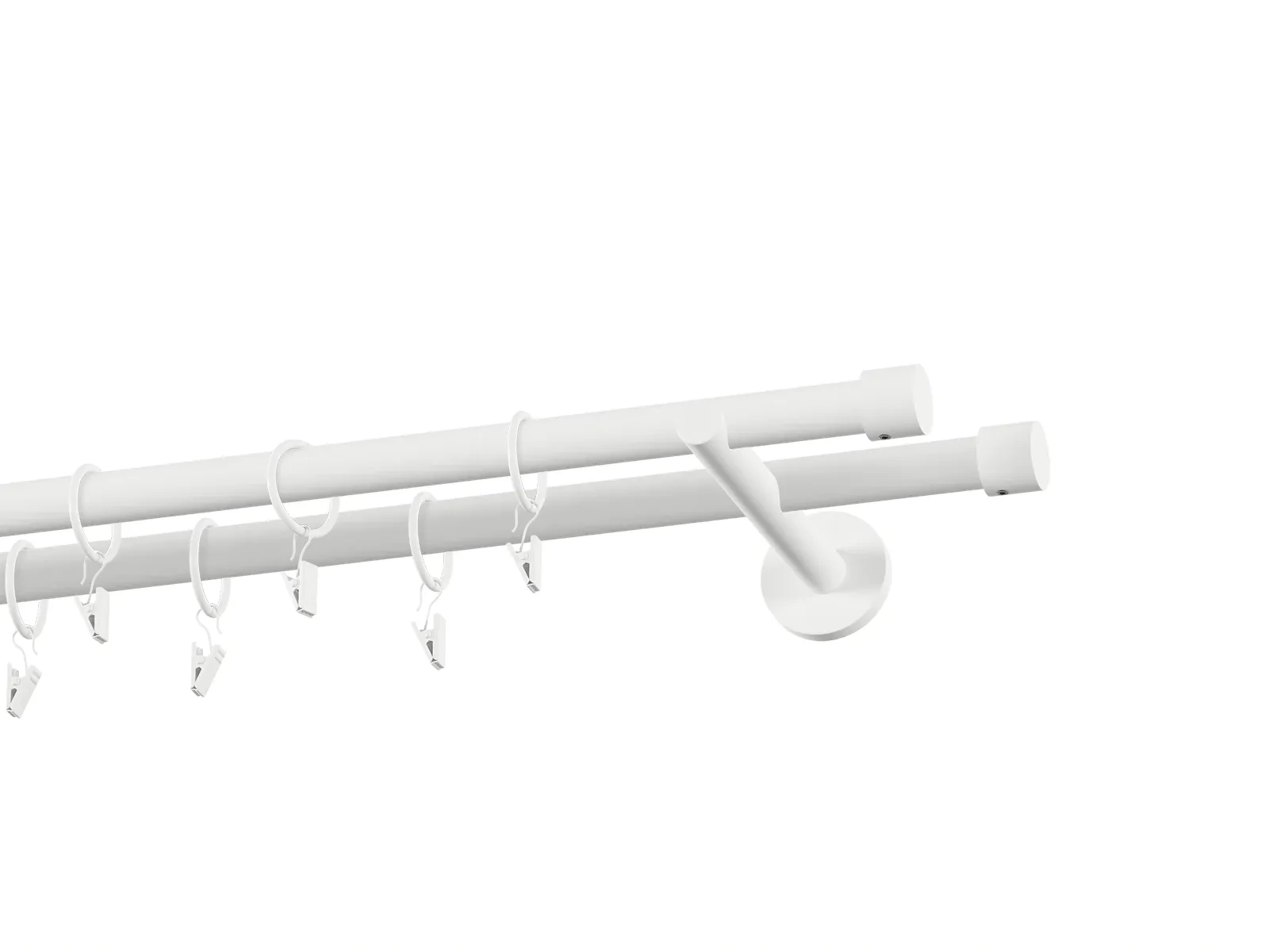 Dvojradová garniža s povrchovou úpravou - biela lakovaná. Garniže sú dodávané sú v kompletoch. Tvar koncovky a typ držiaka podľa zadaného výberu.