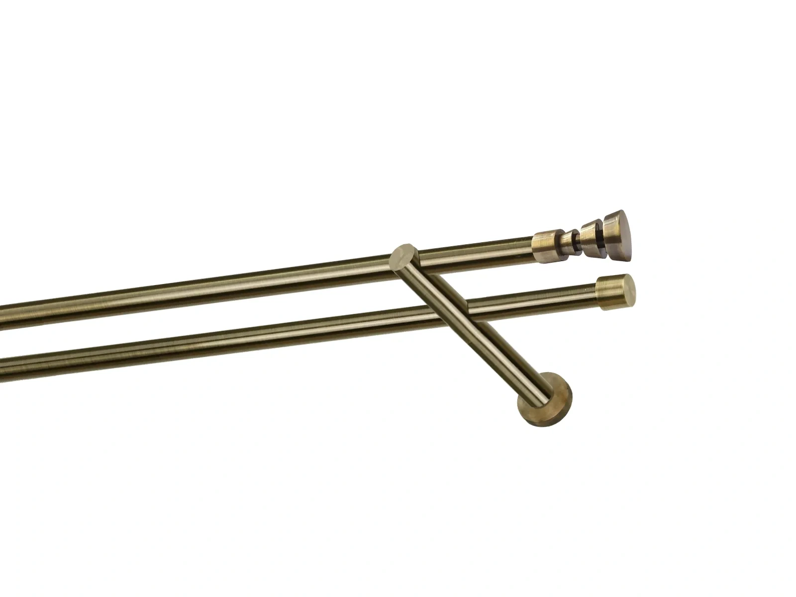 Felületkezelt kétsoros fém függönykarnis antik (matt arany) árnyalat. Minőségi galvanizált fém függönykarnisok. A galvanizálás nagyobb felületi szilárdságot, nagyobb karcállóságot és sima felületet biztosít. Készletként szállítjuk.