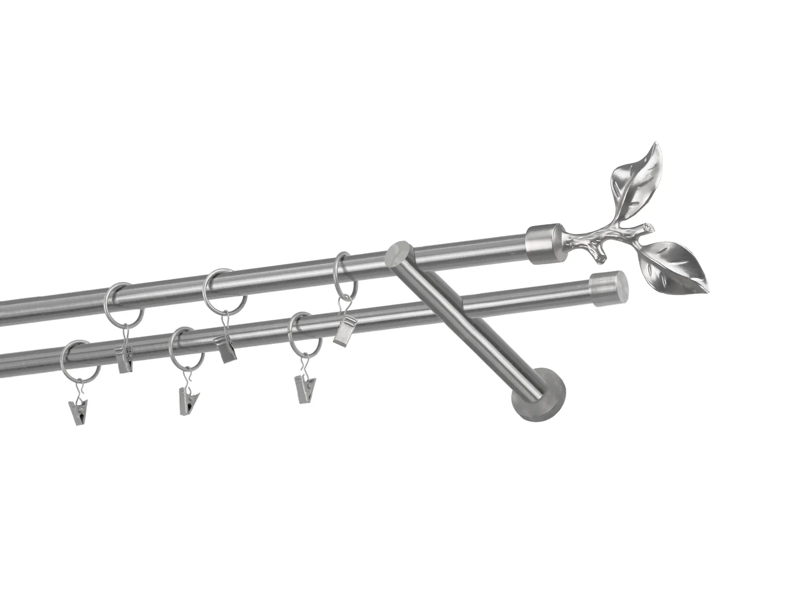 Felületkezelt kétsoros fém függönykarnis satin (matt nikkel) árnyalat. Minőségi galvanizált fém függönykarnisok. A galvanizálás nagyobb felületi szilárdságot, nagyobb karcállóságot és sima felületet biztosít. Készletként szállítjuk.