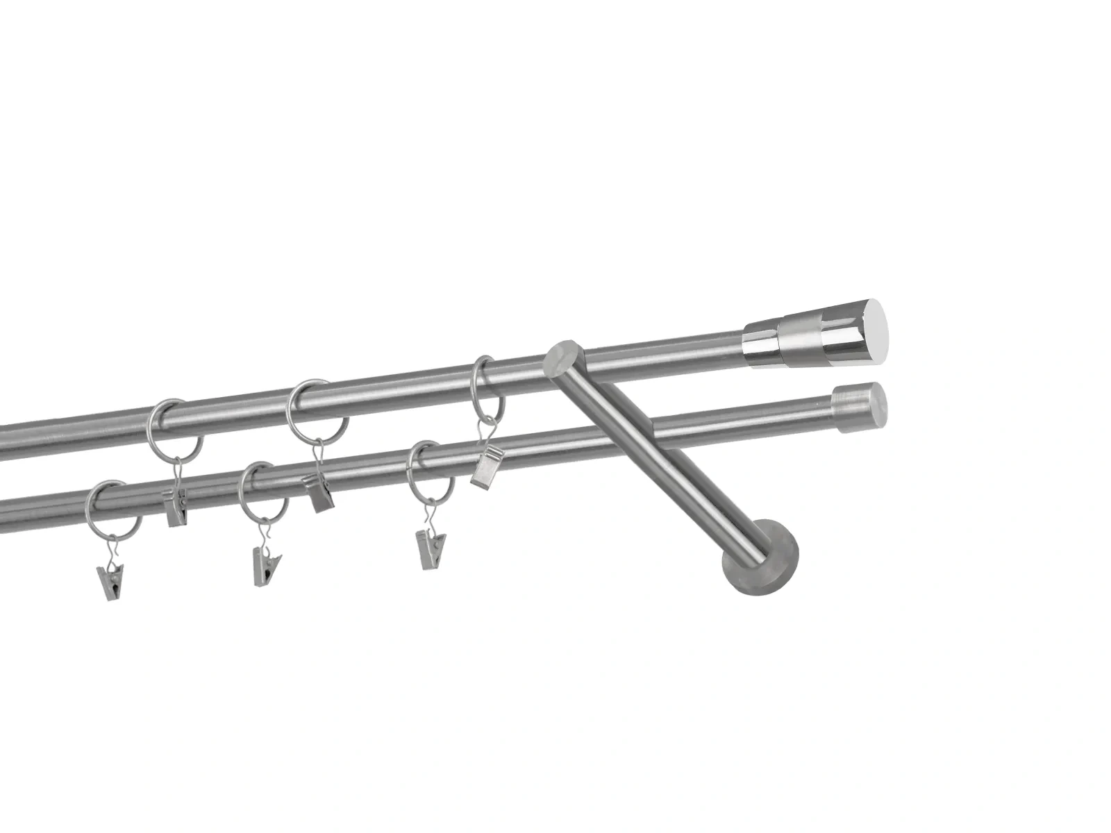 Felületkezelt kétsoros fém függönykarnis satin (matt nikkel) árnyalat. Minőségi galvanizált fém függönykarnisok. A galvanizálás nagyobb felületi szilárdságot, nagyobb karcállóságot és sima felületet biztosít. Készletként szállítjuk.