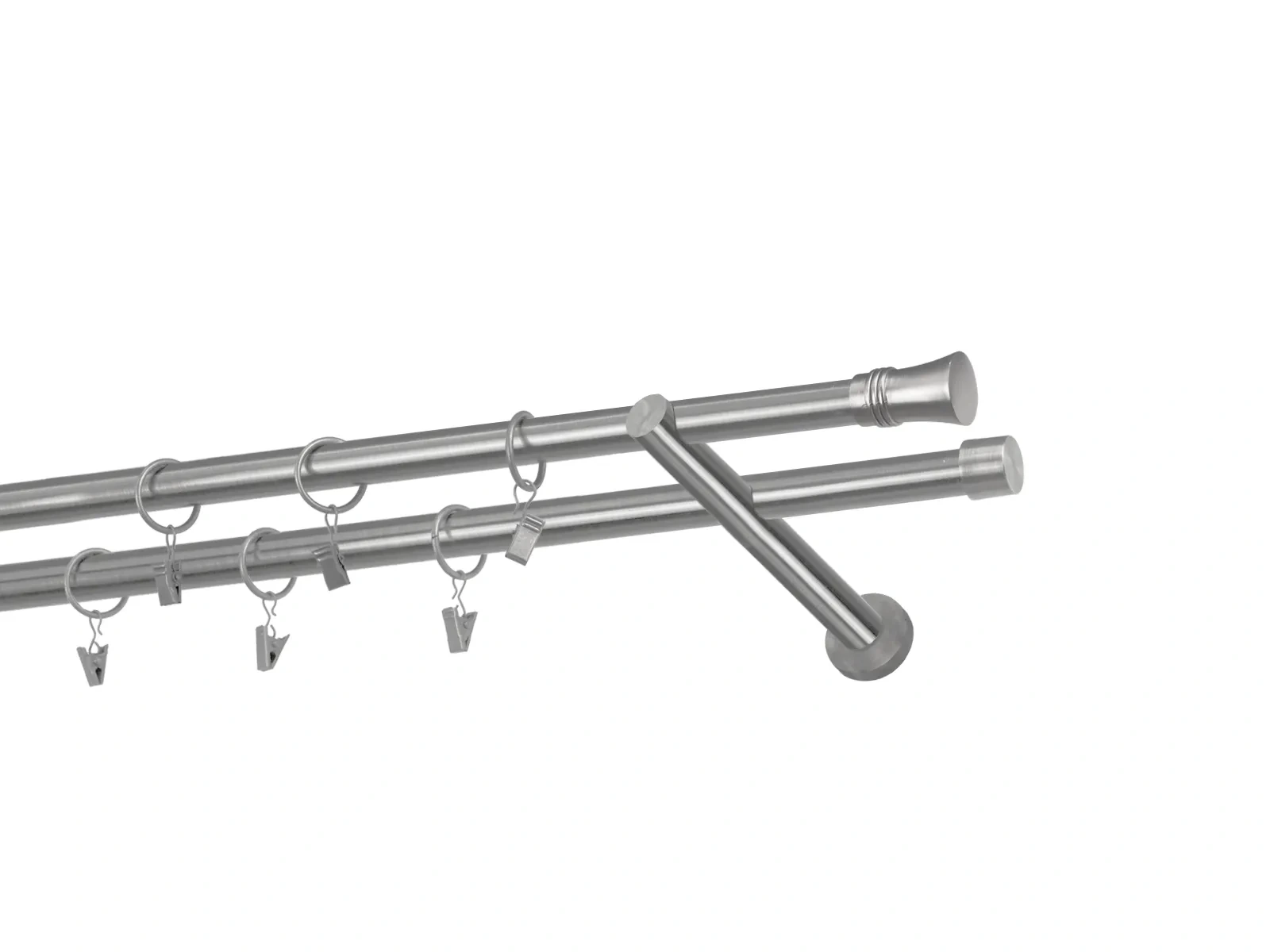 Felületkezelt kétsoros fém függönykarnis satin (matt nikkel) árnyalat. Minőségi galvanizált fém függönykarnisok. A galvanizálás nagyobb felületi szilárdságot, nagyobb karcállóságot és sima felületet biztosít. Készletként szállítjuk.