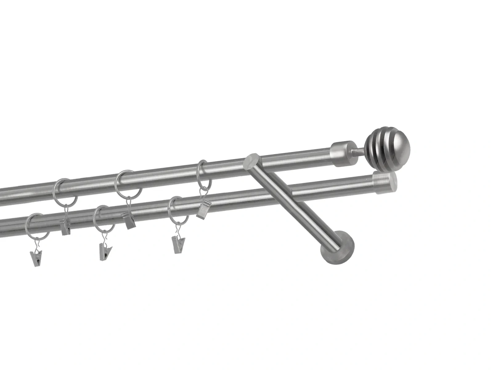 Felületkezelt kétsoros fém függönykarnis satin (matt nikkel) árnyalat. Minőségi galvanizált fém függönykarnisok. A galvanizálás nagyobb felületi szilárdságot, nagyobb karcállóságot és sima felületet biztosít. Készletként szállítjuk.