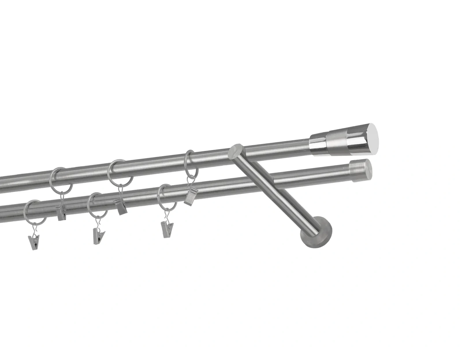 Felületkezelt kétsoros fém függönykarnis satin (matt nikkel) árnyalat. Minőségi galvanizált fém függönykarnisok. A galvanizálás nagyobb felületi szilárdságot, nagyobb karcállóságot és sima felületet biztosít. Készletként szállítjuk.