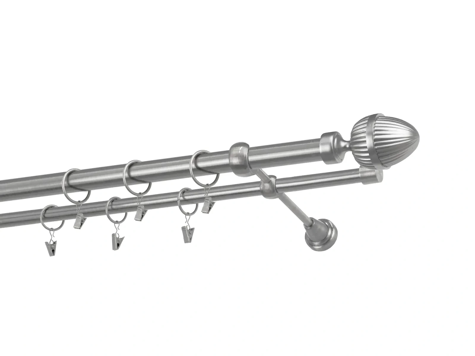 Felületkezelt kétsoros fém függönykarnis satin (matt nikkel) árnyalat. Minőségi galvanizált fém függönykarnisok. A galvanizálás nagyobb felületi szilárdságot, nagyobb karcállóságot és sima felületet biztosít. Készletként szállítjuk.