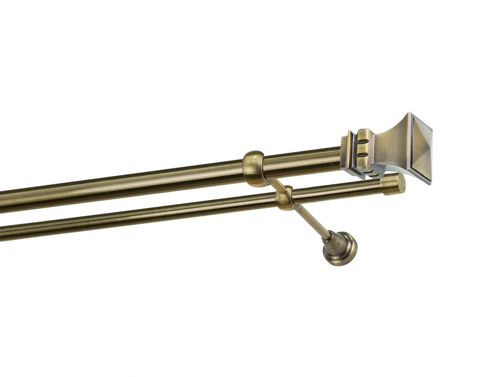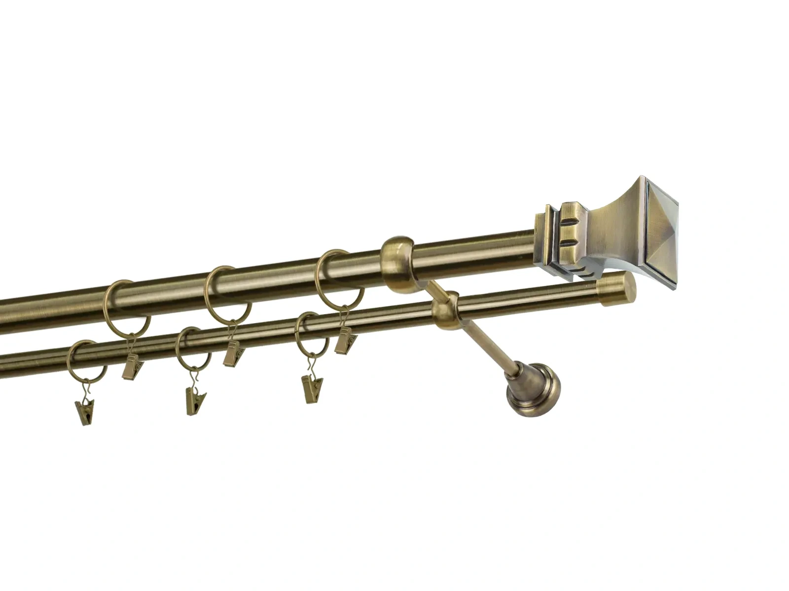 Felületkezelt kétsoros fém függönykarnis antik (matt arany) árnyalat. Minőségi galvanizált fém függönykarnisok. A galvanizálás nagyobb felületi szilárdságot, nagyobb karcállóságot és sima felületet biztosít. Készletként szállítjuk.