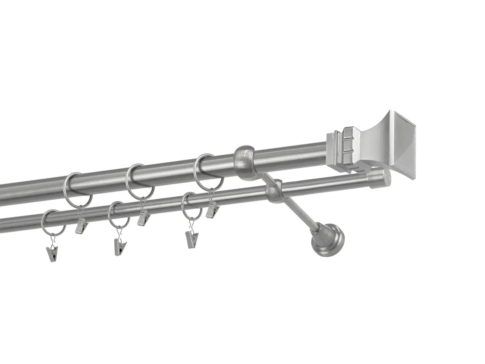 Felületkezelt kétsoros fém függönykarnis satin (matt nikkel) árnyalat. Minőségi galvanizált fém függönykarnisok. A galvanizálás nagyobb felületi szilárdságot, nagyobb karcállóságot és sima felületet biztosít. Készletként szállítjuk.