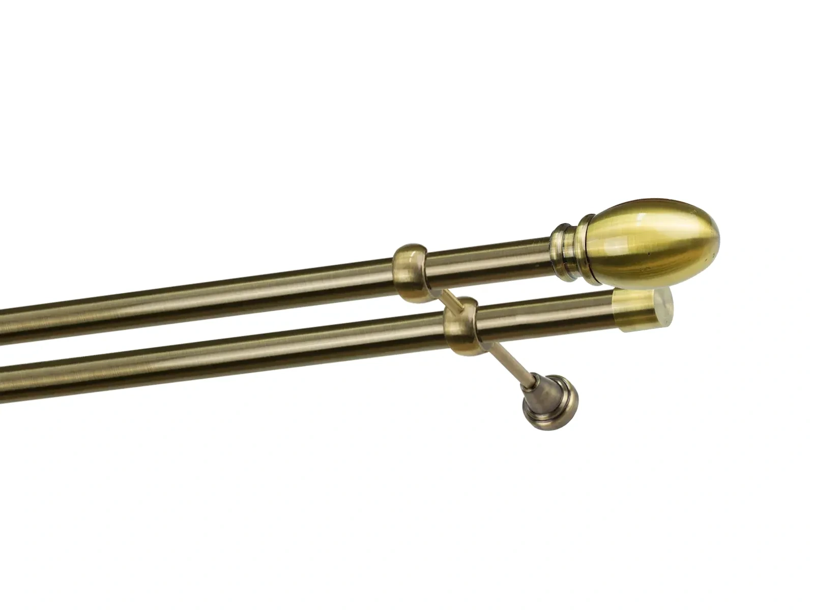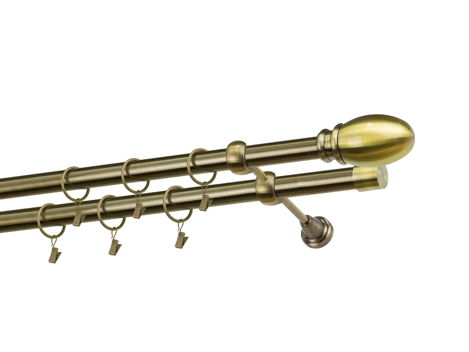 Felületkezelt kétsoros fém függönykarnis antik (matt arany) árnyalat. Minőségi galvanizált fém függönykarnisok. A galvanizálás nagyobb felületi szilárdságot, nagyobb karcállóságot és sima felületet biztosít. Készletként szállítjuk.