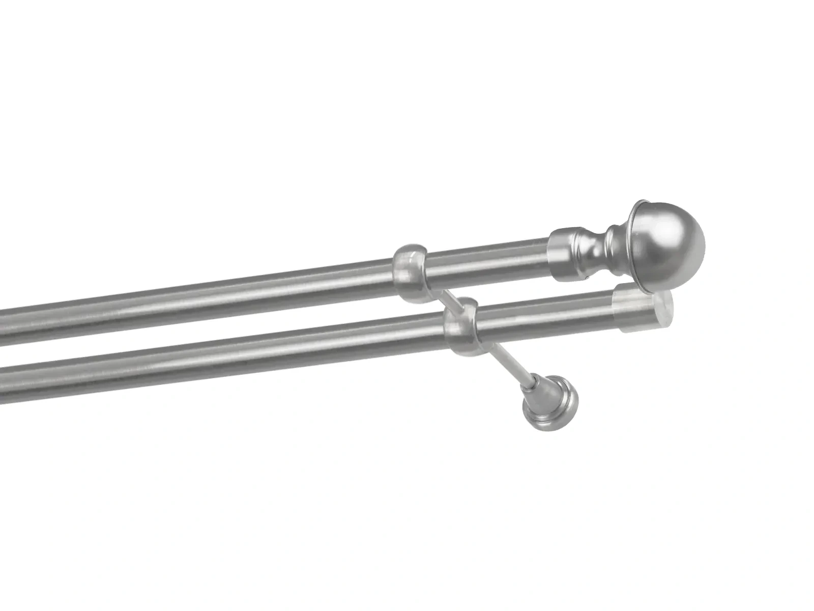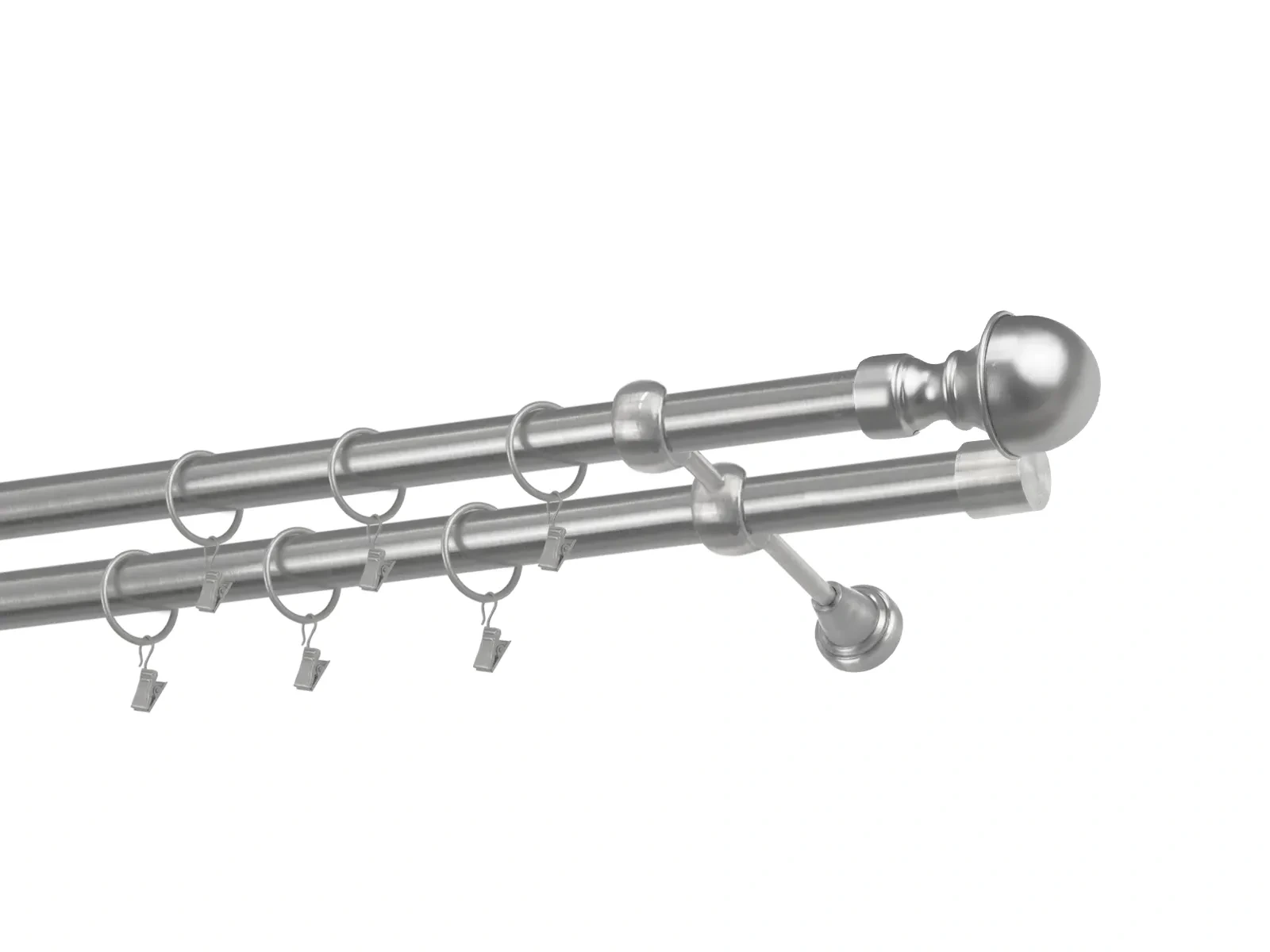 Felületkezelt kétsoros fém függönykarnis satin (matt nikkel) árnyalat. Minőségi galvanizált fém függönykarnisok. A galvanizálás nagyobb felületi szilárdságot, nagyobb karcállóságot és sima felületet biztosít. Készletként szállítjuk.