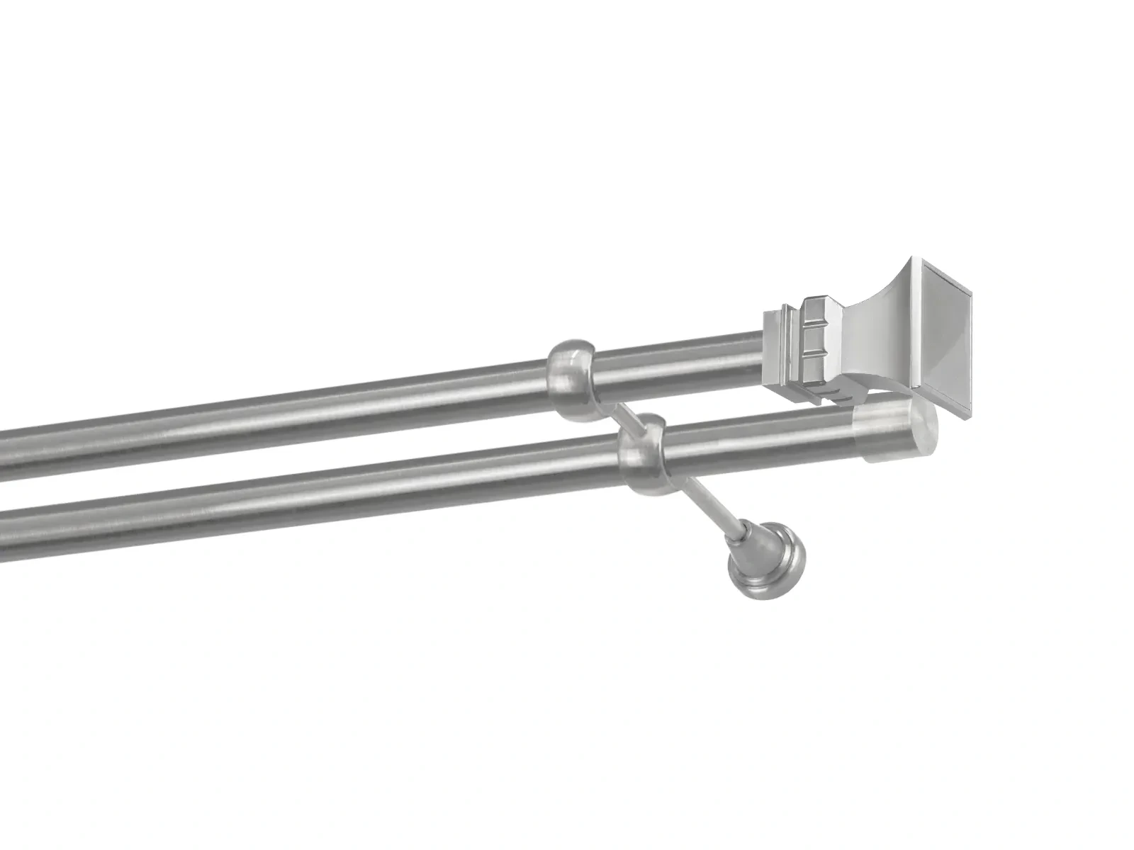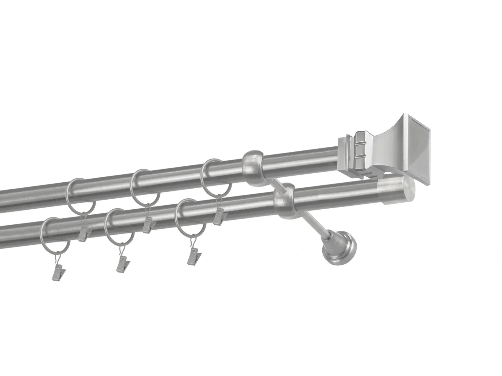 Felületkezelt kétsoros fém függönykarnis satin (matt nikkel) árnyalat. Minőségi galvanizált fém függönykarnisok. A galvanizálás nagyobb felületi szilárdságot, nagyobb karcállóságot és sima felületet biztosít. Készletként szállítjuk.