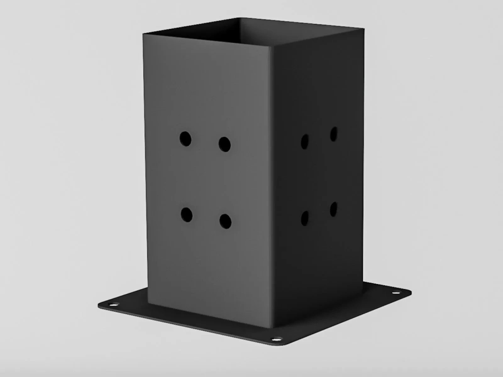 Az oszloptartók felülete fekete porfestékkel van kezelve. Ezek hegesztett alkatrészek, melyek 2mm-es vastagságú horganyzott lemezből készülnek, előre fúrt lyukakkal. A gerenda belső mérete 98x98 mm, ami a teljes szerkezet nagy merevségét biztosítja.